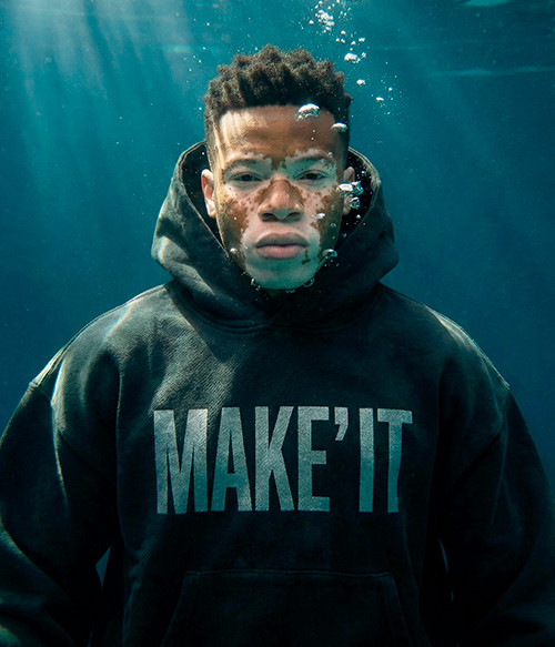 Sudadera con microtextura porosa y estructura premium. MAKE’IT en el centro delantero en blanco, limpio y dominante. Silueta moderna pensada para ser la pieza protagonista del outfit