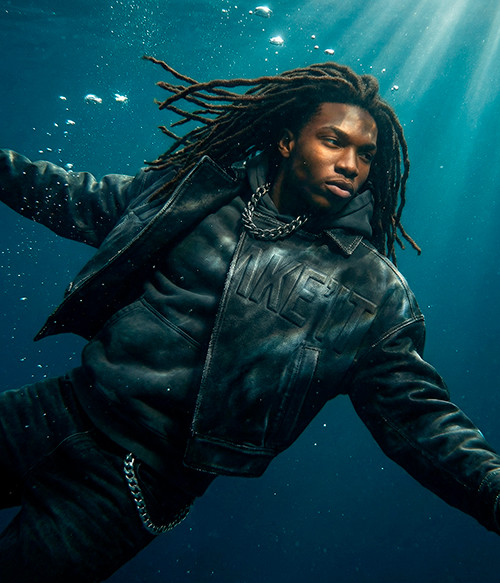 Bomber de cuero de silueta limpia y moderna. Volumen controlado, textura profunda y detalles minimalistas. MAKE’IT aparece como statement gráfico con estética high-fashion y espíritu urbano.